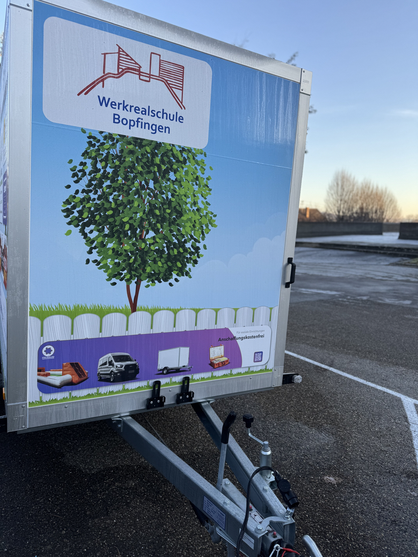 Der Förderkreis der Werkrealschule Bopfingen e.V. hat in Zusammenarbeit mit der Firma Freiraum Sozialsponsoring einen Multi-Funktions-Spiele-Anhänger für den Ganztagesbetrieb der Schule angeschafft. Der Anhänger ist mit Spiel- und Jongliermaterial bestückt und wird für die Schülerinnen und Schüler täglich in der Mittagspause geöffnet. Außerdem ist es der Schule möglich, die Materialien mobil zu verwenden und sie somit bei Schulbesichtigungen, den Bundesjugendspielen, Schulfesten oder der Veranstaltung "Ostalb läuft" auch außerhalb des Schulgeländes zu nutzen.